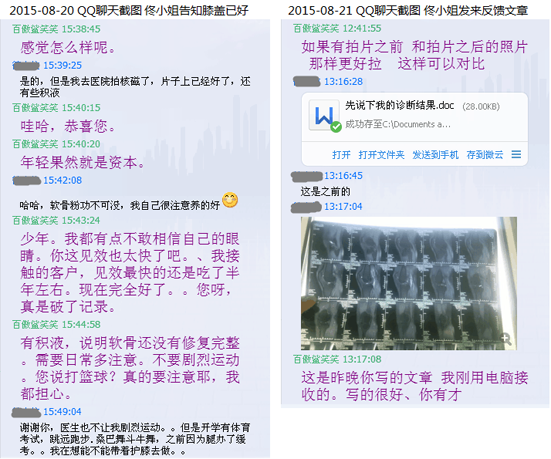 在六月底考察课结束,考试课办了缓考,我爸把我接回家。一回家就跟父母讲了这个药,他们因为我的腿很担忧和发愁,就说买一盒试试吧。我在官网找了笑笑姐聊,觉得她很耐心贴心,态度很好很专业的感觉,让我加深了对这个品牌的信任,劝说了妈妈用银行汇款买了三盒。我从七月初开始吃到现在。我在将近吃了一盒以后,发现关节弹响好了,这让我信心大增,想着再吃3个月应该就好了。(结果比我的预期还好)前几天去做核磁,检查结果是:膝关节少量积液。我看到这个结果简直要高兴的蹦起来,但我的腿让我只能站着。。。虽然核磁显示好了,但我现在走路多了依然关节会疼,医生也告诫我还不能运动或深蹲,否则容易复发。但这个结果已经让我很满意了,我才吃了一个多月呀,真是个奇迹呢,软骨粉功不可没!(谢谢你咯)