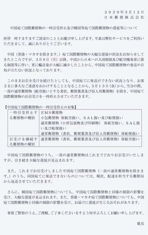 接日本邮局通知,因受新型冠状病毒性肺炎影响,日本飞往中国的飞机停运,自3月12日起,日本邮局将暂时停收发往中国的软骨粉国际邮件。以下附上日方邮局通知文件及翻译文件。